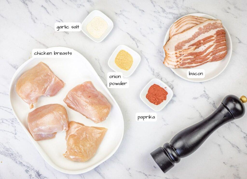 - Wrap each chicken breast with two slices of bacon, securing the ends with toothpicks if necessary.